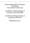 Nederlandse samenvatting van H17 Biopsychology of Emotion, Stress and Health en H18 Biopsychology of Psychiatric Disorders. De samenvatting is voor het selectietentamen dat onderdeel is van de selectieprocedure voor Psychologie aan Universiteit Utrecht. De samenvatting bevat ook aantekeningen van het bijhorende hoor- en werkcollege. Ik heb de selectie behaald met een 7 voor dit tentamen.