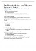 Dit document bevat alle aantekeningen van de colleges van het vak Recht en Instituties van Milieu- en Ruimtelijk Beleid op de Radoud Universiteit. Er staan ook verschillende delen in dat niet met powerpoint werd besproken, maar aan de hand van verschillende websites of wetsartikelen werd besproken. Ook verschillende besproken voorbeelden zijn opgenomen in de aantekeningen. Dit maakt het makkelijker om de stof te begrijpen.