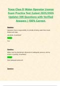 Texas Class D Water Operator License Exam Practice Test (Latest 2025/2026 Update) 300 Questions with Verified Answers | 100% Correct. Texas Class D Water Operator License Exam Practice Test (Latest 2025/2026 Update) 300 Questions with Verified Answers | 100% Correct.