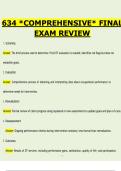 This document is a thorough and highly detailed comprehensive final exam review for OT 634, covering the full scope of occupational therapy evaluation, assessment, documentation, and clinical reasoning concepts required for final examinations. It includes clearly defined terms and explanations related to screening, evaluation, reassessment, outcomes, occupational profiles, top-down and bottom-up approaches, standardized and nonstandardized assessments, reliability and validity, score interpretat...