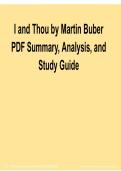 Comprehensive I and Thou by Martin Buber PDF Summary, Analysis, and Study Guide updated 2025/ 2026 with solution. This study guide provides a clear summary of Buber’s key concepts of I-Thou and I-It relationships, deep philosophical analysis, and critical discussion questions. Ideal for philosophy students and readers seeking to understand existential and relational philosophy, strengthen critical thinking, and excel in exams or essays related to Buber’s work.