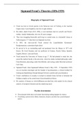 This document is a detailed summary notes of Sigmund Freud`s Theories including the Biography of Sigmund Freud; Psychic determinism; cathexis and anticathexis forces; Personality Theory (Id, Ego & Superego); Unconscious, Conscious & Free association; Dream Analysis (manifest content & latent content); Psychosexual Stages of Development (Oral stage, Anal stage, Phallic Stage, Latent Stage, Genital Stage; and Criticisms of the Psychosexual Stages
