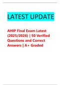 This comprehensive and up-to-date test bank contains 50 verified questions and correct answers for the AHIP Final Exam, fully updated for the 2025/2026 certification cycle. Designed to help insurance agents, brokers, and Medicare professionals pass the AHIP open-book exam with confidence, this resource covers all key topics, including: