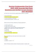 The Nursing Fundamentals Final Exam 2025–2026 includes accurate, real exam-style questions with fully verified correct answers. Designed to strengthen knowledge and improve test readiness, this resource is ideal for nursing students preparing for finals and NCLEX-style exams. Available on Stuvia, it ensures efficient review, better comprehension, and guaranteed confidence for exam success.