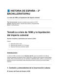 Tema completo y desarrollado sobre La Crisis de 1898 y la liquidación del imperio colonial, perteneciente a Historia de España de 2º de Bachillerato, orientado a Selectividad / EBAU.