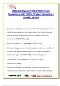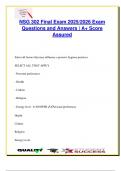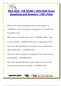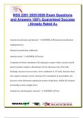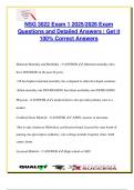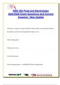 This focused NSG 302 Fluid & Electrolytes exam document includes over 100 graded and verified questions and answers aligned with the 2025/2026 academic year. It covers essential nursing knowledge on fluid compartments, tonicity (hypotonic, hypertonic, isotonic), electrolyte imbalances (Na⁺, K⁺, Ca²⁺, Mg²⁺, Cl⁻, PO₄³⁻), IV fluid types, osmolality, and signs of fluid volume deficit/excess. Acid-base balance (ABG interpretation, metabolic/respiratory acidosis/alkalosis) and nursing...