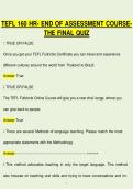 Prepare effectively for the TEFL 160 HR end-of-course final quiz with this verified Q&A resource. Perfect for aspiring English teachers, it offers a reliable way to review key TEFL concepts, strengthen understanding, and boost exam confidence. Ideal for self-study, course review, and final assessment preparation, this guide ensures learners can approach the quiz with clarity, reinforce essential teaching principles, and achieve optimal results. Trusted by students and educators, this resource su...