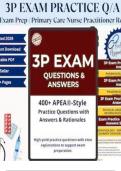 The APEA 3P Exam Solution Test Bank – Version 1 Blueprint is a high-yield Nurse Practitioner exam preparation resource developed to follow the official APEA 3P blueprint. It includes verified and correct questions and answers structured to mirror real APEA predictor-style exams, emphasizing clinical reasoning, assessment, diagnosis, and management in primary care settings. Content spans adult and pediatric care, women’s health, pharmacology, diagnostics, preventive care, and evidence-based p...