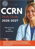 The CCRN Review 2026 – Actual Complete Exam Test Bank is a high-yield critical care nursing exam preparation resource designed to align with the latest AACN CCRN exam blueprint. It includes fully verified and correct questions and answers reflecting real CCRN exam structure, difficulty level, and clinical decision-making standards. Content covers cardiovascular, pulmonary, endocrine, renal, gastrointestinal, neurologic, hematologic, multisystem, professional caring and ethical practice domains...