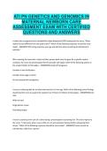 This document contains certified practice questions and answers for the ATI PN Genetics and Genomics in Maternal Newborn Care assessment exam. It covers key topics such as inheritance patterns, genetic screening, prenatal diagnostics, risk factors, counseling, and nursing interventions related to maternal-newborn genetics. The material is structured in a question-and-answer format to support exam preparation and reinforce understanding of core concepts tested on the assessment.