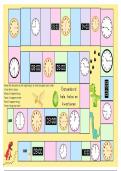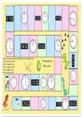 Een klokken ganzenbord waardoor de leerlingen op een spelende manier de analoge en digitale (lage) kloktijden automatiseren. Hele, halve uren en kwartieren.