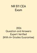 GuruTech Quality Exam Prep Materials!!! 1151 Documentos 0 Tarjetas de estudio 0 Paquetes Community 0 Seguidores 0 Siguiendo 1 Comentarios recibidos 1 0 0 0 0 2 días hace • TestproCenter Relias – Updated 2026 Fetal Heart Monitoring PDF 1151 artículos Todo Documentos Tarjetas de estudio Paquetes Lo más vendido El más nuevo Puntuación NR 546 Final Exam Version 1 & 2 2025 Questions & Answers PDF | NP Psychopharmacology Test Prep (0) $9.99 0x vendido Prepare effectively with the NR 546 Final Exam Version 1 & 2 2025 Questions & Answers PDF, a comprehensive study resource for nurse practitioner students specializing in psychopharmacology. This document includes the latest exam-style questions from both versions with accurate answers, covering key topics such as psychiatric medications, treatment planning, and clinical decision-making. Ideal for final revision and self-assessment, this guide helps reinforce knowledge, improve exam performance, ... i x Examen • 72 páginas • por gurutech • subido 2026 Vista rápida i x NR 546 • NR 546 NR 511 CEA Exam Questions & Answers PDF | Nurse Practitioner Clinical Evaluation Test Prep (0) $9.99 0x vendido Prepare with confidence using the NR 511 CEA Exam Questions & Answers PDF, a comprehensive study resource for nurse practitioner students. This document includes realistic, exam-style questions with accurate answers covering key clinical evaluation concepts, helping you reinforce knowledge, assess readiness, and improve exam performance. Ideal for revision and self-assessment, this guide provides the focused practice and confidence needed to succeed in your NR 511 CEA exam.