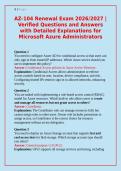 Prepare for the AZ-104 Renewal Exam 2026/2027 with this comprehensive study guide featuring verified questions and answers with detailed explanations. This resource covers all essential Azure Administrator skills, including virtual machines, storage, networking, identity management, security, monitoring, and governance, fully aligned with Microsoft’s official exam objectives. Each question includes step-by-step rationales, helping you understand concepts and master practical scenarios for real...