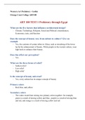 This document includes all the possible questions that could be asked in the test on prehistory through Egypt with answers: What are the five factors that influence architectural design? three forms or reliefs? is the concept of beauty universal?