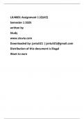 Jzntuli21 On this page, you find all documents, package deals, and flashcards offered by seller jzntuli21. 14 Documents 0 Flashcards 1 Package deal Community 5 Followers 31 Following 4 Reviews received 2 1 1 0 0 7 months ago • annaphillips42 LJU 4801 MQS (Question and answer)semester 2 2024 11 months ago • pamelamilase TLI 4801 ASSIGNMENT 02 SEMESTER 02:100% PASS 1 year ago • patiencepatience774 PVL 3703 Assignment 01 2025 1 year ago • nomhlebetty841 LML4805 INSURANCE LAW assignment 1 2025 Nice assignment 15 items Everything Documents Flashcards Package deal Best sold Newest Rating International Law - LCP4801 01 2025 100% (0) $3.37 1x sold International Law - LCP4801 assignment 01 2025, pass with references, question and answer. i x Package deal Other • 6 pages • by jzntuli21 • uploaded 2025 Quick View i x University of South Africa (Unisa) • International Law LCP4801 AND LML4806 PASS 2025 ASSIGNMENT 01 • By  jzntuli21 PVL 3703 Assignment 01 2025 (1) $3.37 1x sold Law of Delict Assignment 01 semester 01 2025 pass with 100%, question and answer. i x Other • 4 pages • by jzntuli21 • uploaded 2025 Quick View i x University of South Africa (Unisa) • Law of delict 100%MULTIPLE CHOICE, QUESTION AND ANSWER, LJU4801 2025 1ST SEMESTER (0) $3.37 0x sold 100%MULTIPLE CHOICE, QUESTION AND ANSWER, LJUST SEMESTER i x Other • 14 pages • by jzntuli21 • uploaded 2025 Quick View i x University of South Africa (Unisa) • philosophy 4801 LJU 4801 MQS (Question and answer)semester 2 2024 (1) $3.12 1x sold second semester( semester 02) assignment (01) pass LJU 4801 multiple choice, 100% all questions are answered from question 01 to question 10 multiple questions. guaranteed