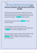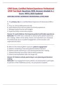 This document contains an extensive CPXP exam test bank with multiple-choice questions and clearly explained answers covering the full scope of the Certified Patient Experience Professional certification. It addresses key topics such as patient-centered care, HCAHPS, leadership, communication, health equity, experience design, measurement, and performance improvement. The material is updated for 2026 and is suitable for thorough exam preparation, self-study, and review.