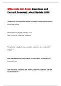 This document contains an updated QMA state test exam study guide with comprehensive questions and correct, verified answers covering the full scope of Qualified Medication Aide responsibilities. It includes medication administration rights, reporting and documentation, medication errors, resident rights, confidentiality and privacy, abuse and neglect prevention, legal and ethical principles, vital signs, oxygen use, controlled substances, PRN medications, topical and oral medications, G-tube ad...
