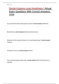 This document is an updated Dental Hygiene Local Anesthesia exam study guide containing exam questions with correct, verified answers focused on the administration and management of local anesthesia in dental hygiene practice. It covers essential topics including anesthetic types, injection techniques, anatomical landmarks, nerve innervation, dosage calculations, vasoconstrictors, complications, contraindications, patient management, and safety protocols. The material is structured to support fo...