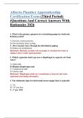 This document is an updated Alberta Plumber Apprenticeship Certification Exam (Third Period) study guide containing comprehensive exam questions with correct, verified answers and clear rationales. It covers essential plumbing topics including hydronic and steam heating systems, boilers, pumps, expansion tanks, gas piping, backflow prevention, potable water systems, drainage and venting, code requirements, materials and fittings, safety devices, and troubleshooting scenarios commonly tested in t...