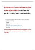 This document is an updated National Board Inservice Inspector (NBIS) certification exam study guide featuring extensive exam questions with correct, verified answers and detailed rationales. It covers critical inspection topics such as boiler and pressure vessel operation, safety devices, MAWP, hydrostatic testing, corrosion mechanisms, welding defects, nondestructive examination methods, inspection procedures, reporting requirements, and code-based decision-making commonly tested on the NBIS e...