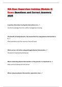 This document is the updated SIA Door Supervisor Training Module 4 exam study guide focusing on physical intervention, conflict management, and duty of care requirements set by the Security Industry Authority (SIA). It contains exam questions with correct answers covering key topics such as dynamic risk assessment, proportional use of force, positional asphyxia, acute behavioural disturbance (ABD), psychosis indicators, communication during restraint, ground restraint risks, legal responsibiliti...
