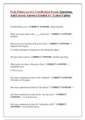 This document contains the updated Peak Pilates Level 1 Certification Exam with comprehensive exam questions and correct, verified answers aligned with the official Peak Pilates curriculum. It covers essential topics including Pilates principles, anatomy and biomechanics, the powerhouse, breathing techniques, posture and alignment, mat and apparatus exercises, repetitions and sequencing, teaching methodology, contraindications, modifications, and client safety.