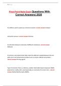 This document is the updated Pivot Point Nails exam study guide containing exam questions with correct answers covering core nail technology theory and practical knowledge. It includes essential topics such as nail anatomy and physiology, nail growth, disorders and diseases, manicure and pedicure procedures, nail shapes, massage techniques, artificial nail systems, acrylics and gels, wraps, tools and implements, chemistry basics, sanitation, and safety standards. The material is organized for ef...