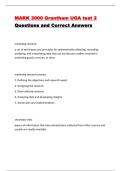 This document is the updated MARK 3000 Test 2 exam study guide containing exam questions with correct answers covering core marketing concepts taught at UGA and Grantham University. It focuses on marketing research, data analysis, consumer behavior, product strategy, branding, new product development, pricing strategies, distribution channels, supply chain management, and promotion fundamentals. The material is organized for efficient review and is ideal for reinforcing key terminology, concepts...