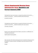 This document is the latest updated Illinois Supplemental Nursing Home Administrator exam study guide containing actual exam questions with correct answers based on current Illinois long-term care laws and IDPH regulations. It focuses on supplemental, state-specific content required for licensure, including facility licensing periods, permits and approvals, ownership disclosure, inspection processes, violation classifications (Levels AA, A, B, and C), plans of correction, penalties, conditional ...