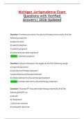 This document is the updated Michigan Jurisprudence exam study guide containing actual exam questions with correct, verified answers based on current Michigan statutes and administrative rules. It covers essential jurisprudence topics including licensure, registration, scope of practice, supervision requirements, renewal and relicensure, disciplinary actions, prescription requirements, record retention, continuing education rules, board structure, and professional legal definitions. The material...