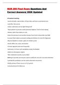 This document is the updated NUR 290 Final Exam study guide containing exam questions with correct answers and clear explanations aligned with current nursing course objectives. It covers key topics such as nursing fundamentals, patient assessment, clinical judgment, pharmacology basics, safety and infection control, prioritization, delegation, and critical thinking concepts commonly tested on the NUR 290 final exam. The material is structured to support focused review, reinforce core nursing kn...