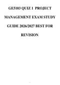 4. time, cost, output Correct answ... i x Exam (elaborations) • 6 pages • by lectdenis • uploaded 2026 Quick View i x Chamberlain College Of Nursing • GE5103 GE5103 QUIZ 1 PROJECT MANAGEMENT EXAM STUDY GUIDE 2026/2027 BEST FOR REVISION (0) $6.99 0x sold GE5103 QUIZ 1 PROJECT