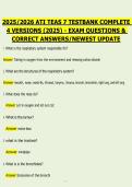 This document contains a complete ATI TEAS 7 Test Bank for 2025–2026, featuring 4 full versions of exam-style questions with correct answers. It covers all major TEAS subject areas, including Anatomy & Physiology, Biology, Chemistry, Scientific Reasoning, Human Body Systems, Genetics, and Basic Physical Science concepts.