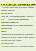 This document contains a complete 30-hour Washington Real Estate Practice Exam designed to prepare students for the Washington State Real Estate Broker licensing exam. It includes over 290 realistic exam-style questions with correct answers, covering Washington real estate law, agency relationships, trust accounts, property management, contracts, licensing requirements, disclosures, and Department of Licensing regulations.