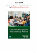 Test Bank - Classroom Management for Elementary Teachers, 10th Edition ( Evertson, 2017), Chapter 1-12 | All Chapters....Chapter 1 Introduction to Classroom Management, Chapter 2 Building Supportive and Healthy Classroom Relationships, Chapter 3 Organizing Your Classroom and Materials, Chapter 4 Establishing Classroom Rules and Procedures, Chapter 5 Procedures for Managing Student Work, Chapter 6 Getting Off to a Good Start, Chapter 7 Planning and Conducting Instruction, Chapter 8 Managing Coope...