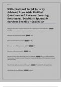 This document is a comprehensive study guide for the NSSA® (National Social Security Advisor) certification exam, featuring verified questions and answers. It thoroughly covers key topics such as retirement benefits, disability benefits, spousal and survivor benefits, and Social Security rules and eligibility. Designed as a reliable exam preparation tool, it simplifies complex Social Security concepts and helps candidates confidently prepare for the NSSA certification. The material is marked Gr...