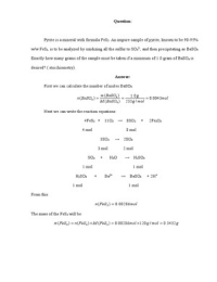 Pyrite is a mineral with formula FeS2. An impure sample of pyrite, known to be 90-95% w/w FeS2, is to be analyzed by oxidizing all the sulfur to SO42-, and then precipitating as BaSO4. Exactly how many grams of the sample must be taken if a minimum of 1.0 gram of BaSO4 is desired? ( stoichiometry).