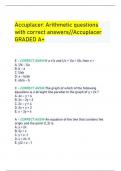 Accuplacer: Arithmetic questions with correct answers//Accuplacer GRADED A+ E - CORRECT ANSW-If a ≠ b and 1/x + 1/a = 1/b, then x = A. 1/b - 1/a B. b - a C. 1/ab D. a - b/ab E. ab/a - b C - CORRECT ANSW-The graph of which of the following equations is a