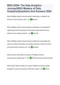 This document contains structured questions and clear answers for WGU D204: The Data Analytics Journey in the Master of Science in Data Analytics program. It covers key concepts such as the data analytics lifecycle, business problem framing, data acquisition, data preparation, analysis, visualization, and communicating insights. The material is designed to support focused exam preparation and revision aligned with the 2026 WGU D204 assessment.