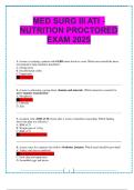 D. Autoimm... i x Exam (elaborations) • 24 pages • by NjoguAmos • uploaded 2025 Quick View i x NGN ATI MED-SURG • NGN ATI MED-SURG MED SURG III – ATI Nutrition Proctored Exam 2025 | Complete Practice Questions with Answers (0) $16.99 0x sold This document contains a comprehensive collection of Medical-Surgical Nursing III (MED SURG III) nutrition-related ATI practice questions and answers for the 2025 exam. It includes over 80 multiple-choice questions covering major topics such as therapeutic diets, enteral and parenteral nutrition, lab interpretation, vitamin and mineral deficiencies, and culturally specific dietary practices. Each question is accompanied by the correct answer, making it an excellent study resource for nursing stu... i x Exam (elaborations) • 21 pages • by NjoguAmos • uploaded 2025 Quick View i x MED SURG ATI - NUTRITION • MED SURG ATI - NUTRITION NGN ATI MED-SURG PROCTORED EXAM REVIEW 2023 (0) $15.39 0x sold NGN ATI MED-SURG PROCTORED EXAM REVIEW 2023