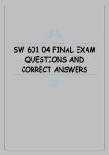 This document contains final exam questions with correct and verified answers for the SW 601 04 policy course. It covers major policy concepts including social welfare policy analysis, policy formulation and implementation, ethical and legal considerations, advocacy strategies, and the impact of policy on social work practice and vulnerable populations.