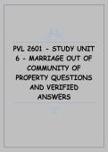 This document contains exam-focused questions with verified and accurate answers for Study Unit 6 of the PVL2601 Private Law course, covering marriage out of community of property. It addresses key concepts such as antenuptial contracts, exclusion of the community of property, accrual system principles, and the legal consequences for spouses’ estates.