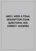 This document contains verified questions and correct answers for the Week 8 final description exam in NR511 Advanced Health Assessment. It covers detailed patient assessment techniques, system-based examinations, diagnostic reasoning, interpretation of clinical findings, and application of evidence-based practice for comprehensive exam preparation.