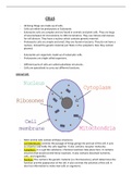 Summary of what cells are, the two main types of cells which are eukaryotes and prokaryotes. Different components of plant cells, animal cells and bacterial cells are listed. The functions of those sub-cellular components explained.