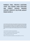 Access the NURS 6311 Final Exam – Previous & Revised Questions, fully updated for 2026/2027. This resource provides comprehensive advanced nursing practice exam questions with verified answers and detailed rationales, covering patient assessment, clinical decision-making, pharmacology, evidence-based practice, and management of complex health conditions. Designed for NURS 6311 students and advanced practice nursing candidates, this guide reinforces essential concepts, strengthens exam readines...