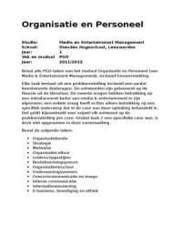 Alle taken met onderzoeksvragen over Media & entertainment in zijn algemeenheid voor het vak Probleem Gestuurd Onderwijs (PGO) van moduul Organisatie en personeel 2011/2012. Met o.a. antwoord op de volgende begrippen: Organisatiekunde, Strategie, Motivatie, Organisatiecultuur, Leiderschapsstijlen, Besluitvormingsproces, Organisatiestructuur, Ondernemingsvormen, Concerncommunicatie en imago, Interne communicatie, Informatievoorziening, E-business, beveiliging en ethiek.