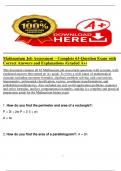 This document contains all 63 Mathnasium job assessment questions with accurate, well-explained answers that earned an A+ grade. It covers a wide range of mathematical concepts including geometry formulas, algebraic problem-solving, unit conversions, trigonometry, polynomial classification, vectors, coordinate transformations, and probability/combinatorics. Also included are real-world application problems, sequence and series formulas, and key computational examples, making it a complete and pr...