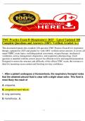This document contains the full 140 questions and answers from the latest updated 2025 TMC Exam A for respiratory therapy, all 100% verified and graded with an A+ rating. It comprehensively covers key topics in respiratory care, including patient assessment, mechanical ventilation, oxygen therapy, airway management, diagnostics, and pharmacology. Each question is paired with the correct answer, providing a reliable and efficient study resource for exam preparation. Designed to match current NBRC...