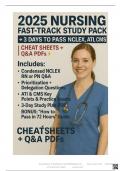 This document is a complete fast-track study pack for nursing students preparing for the NCLEX RN or PN exam. It includes condensed question-and-answer sets, prioritization and delegation scenarios, ATI and CMS key points, and practice exams. Designed to be completed in 3 days, the pack also contains a structured study plan and a bonus “How to Pass in 72 Hours” guide for last-minute preparation. Ideal for accelerated review before exam day.