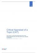 Dit is mijn CAT (Critical Appraisal of a Topic), geschreven in cursus 7 Zorg verlenen bij Circulatiestoornissen van de opleiding Huidtherapie aan Hogeschool Utrecht. De CAT is beoordeeld met een 8,2! Je kunt dit verslag als voorbeeld gebruiken voor het schrijven van je eigen CAT.